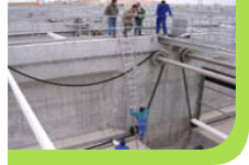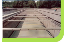 The blades have easily replaceable Nylon wear shoes to slide on PP strips fixed on the tank floor as well as onto AISI 304 strips on top which are fixed on the side walls at the tank water surface level.
